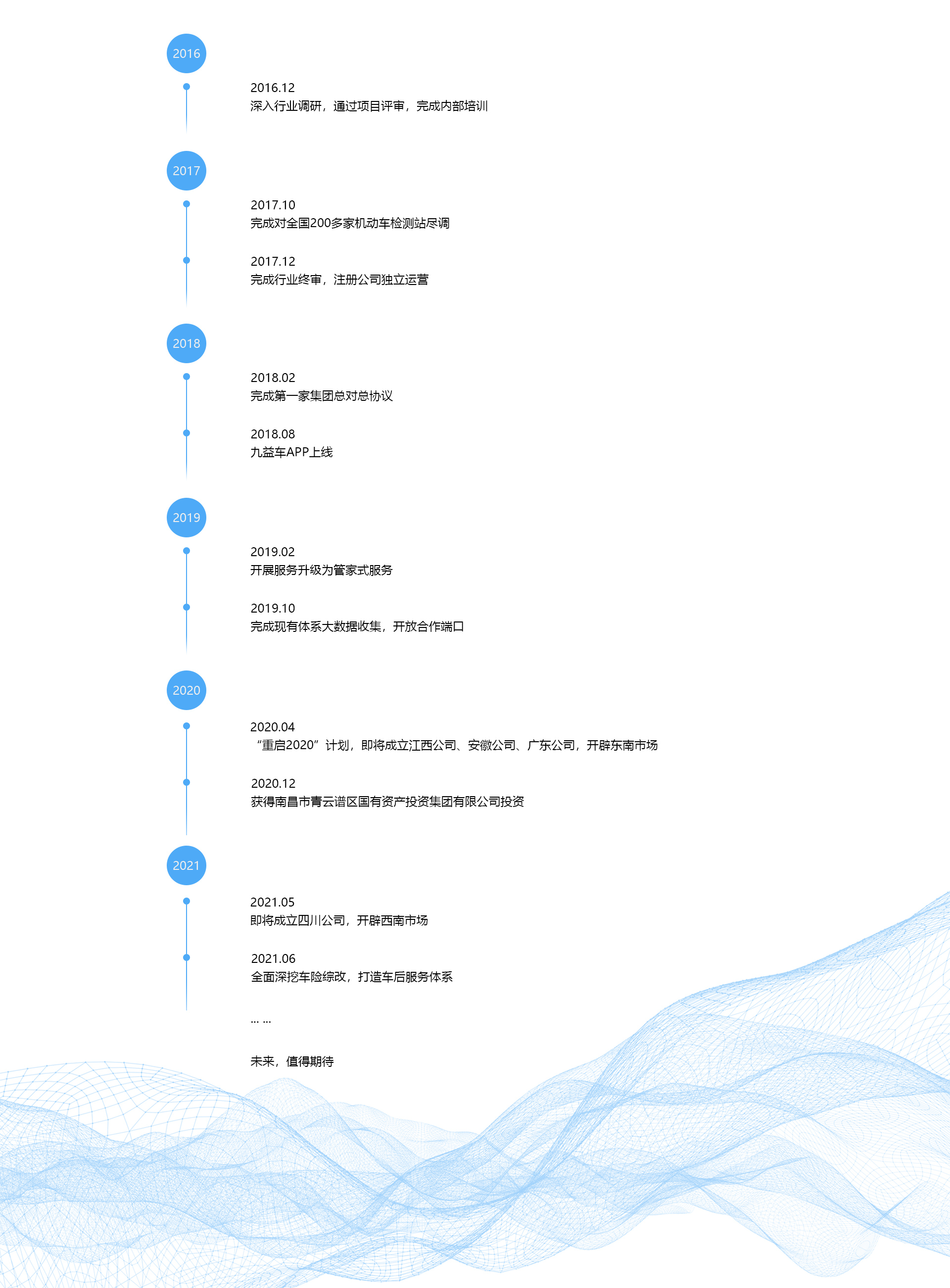 山东九益车信息科技股份有限公司(简称“九益车”)正式组建于2017年末,是目前国内覆盖面最广的汽车第三方检测平台。旨在通过整合汽车检测资源为广大车主和主机厂提供更加全面和安全的车辆真实数据,并以此为基础向汽车日常消费领域扩展,同时为政府职能部门针对车辆进行有效监管提供辅助。